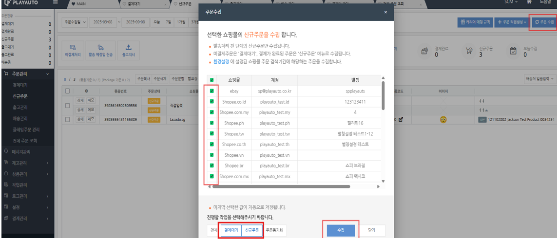 2) 주문 수집 대상 쇼핑몰 체크 -> 주문 수집 클릭