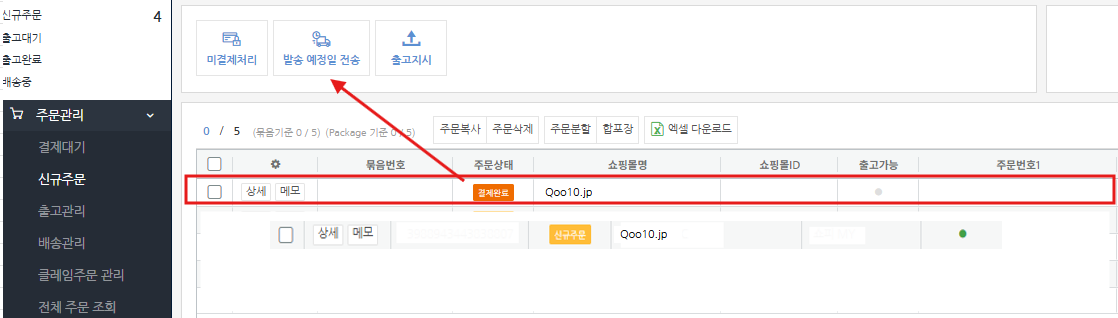 [발송 예정일 전송] 작업 및 신규 주문 상태로 변경 후 출고 작업이 진행 가능합니다.
