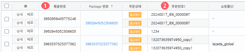 합포장이 아닌 개별 포장 주문건도 단독으로 묶음번호를 가질 수 있으며, 주문분할/합포장 시 묶음번호가 새로 발번됩니다.