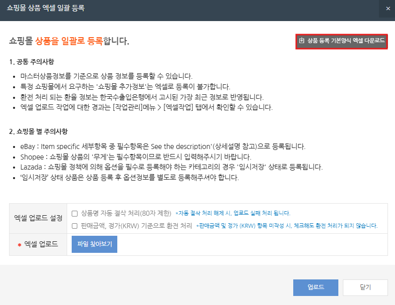 (기본양식 다운로드 경로 : 상품관리 > 쇼핑몰 상품 관리 > 쇼핑몰