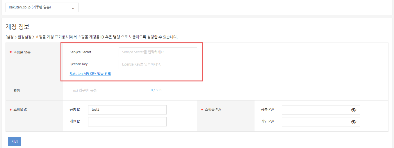 솔루션에 라쿠텐 쇼핑몰 계정 등록 시 아래의 4가지 정보를 필수로 입력해주셔야 합니다.
