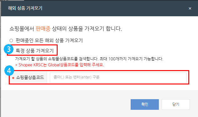 ① 쇼핑몰 상품 가져오기 (해외/국내 해외 판매상품 가져오기 선택)> ② 계정 선택 후 가져오기 클릭 > ③ 특정상품 가져오기 체크 > ④쇼핑몰 상품코드 입력 후 하단 확인 버튼 클릭