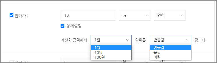 - 상세설정에 체크하면 선택한 단위(1원, 10원, 100원)로 반올림, 올림, 버림 처리