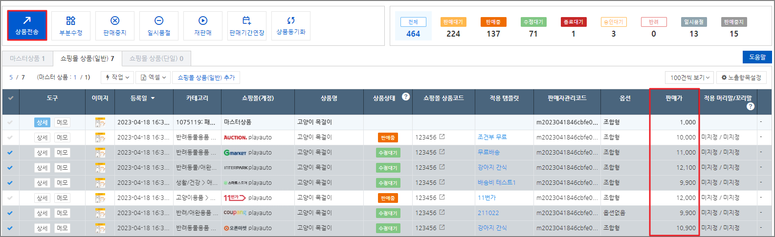 2. 수정된 판매가 확인 후 '수정대기' 상태 상품 [상품전송] 작업