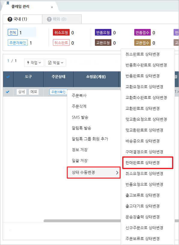 *[상태 수동 변경] 방법: 주문> 클레임 관리> 해당 주문 마우스 우클릭> 상태 수동 변경> 원하는 주문 상태 선택