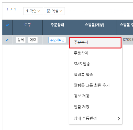 (단, 복사된 주문으로는 쇼핑몰과의 통신 작업이 불가합니다.)