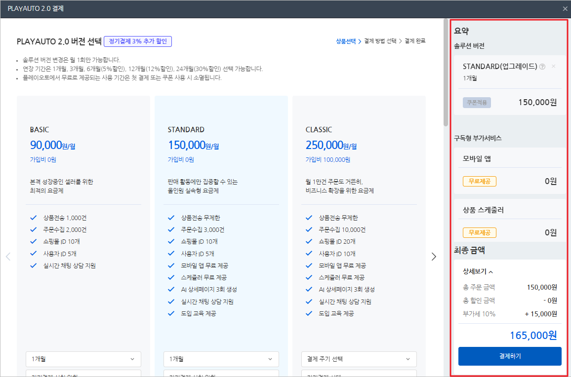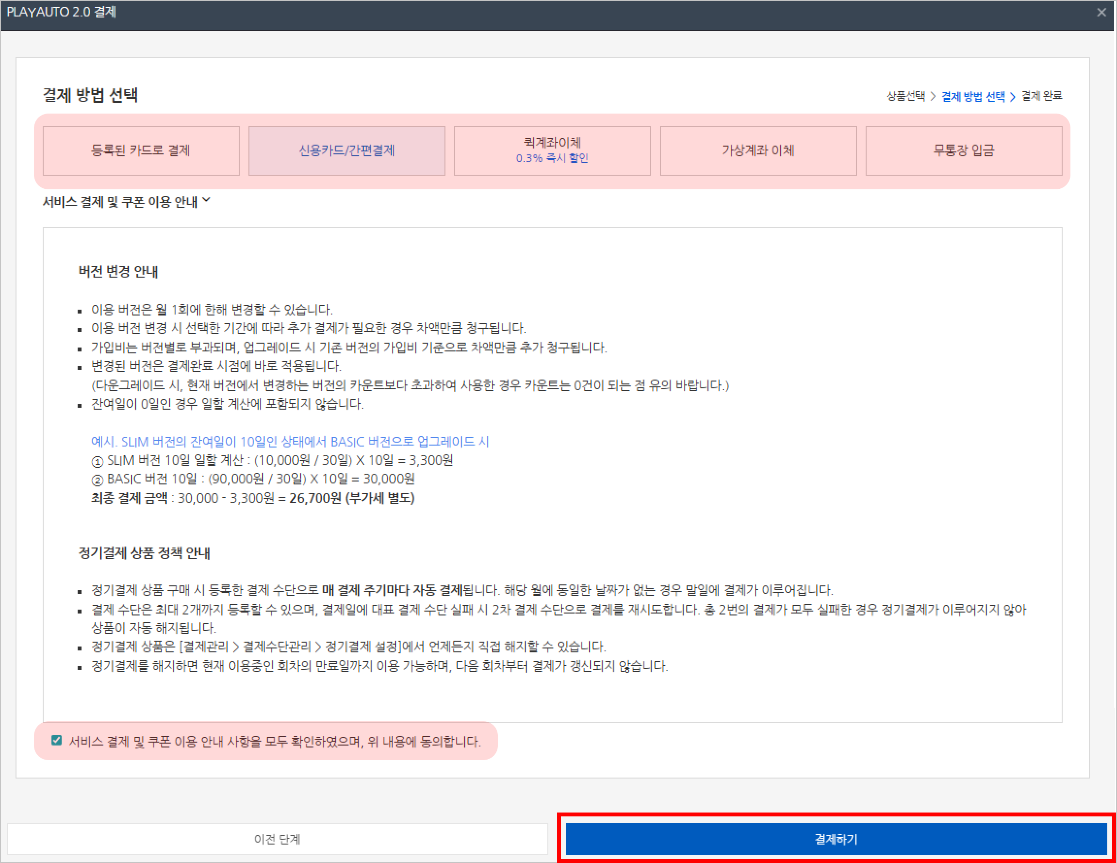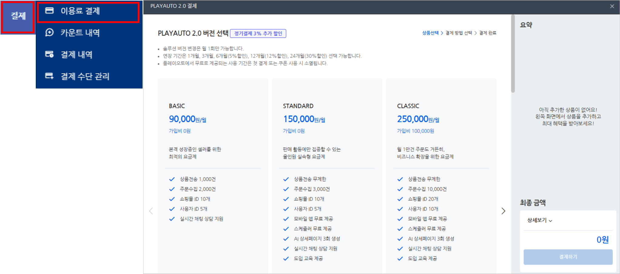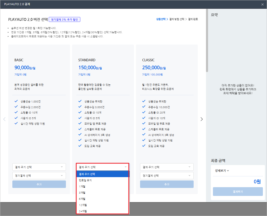 - 정기결제 설정 시 카드 정보 등록은 필수이며 선택한 버전 및 개월 주기에 따라 이용기간 만료 당일 18시에 자동 결제가 진행됩니다.