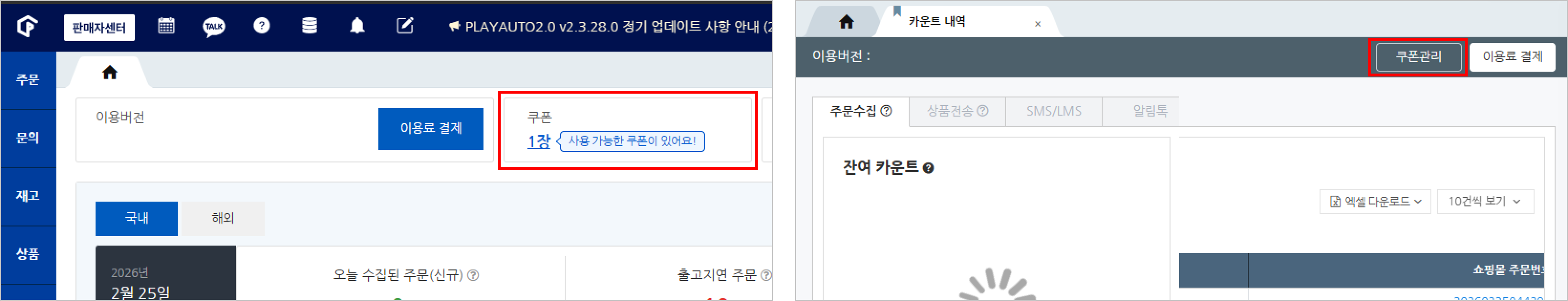 발행된 쿠폰은 솔루션 홈 화면의 쿠폰 영역 또는 결제> 카운트 내역> 우측 상단의 [쿠폰관리] 버튼 클릭 후 팝업창에서 확인 가능합니다.