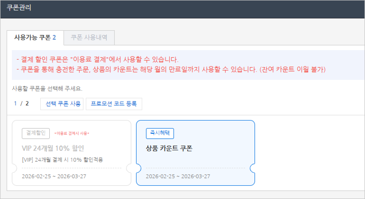'즉시혜택' 쿠폰의 경우 [선택 쿠폰 사용] 버튼으로 사용이 가능하며, '*이용료 결제시 사용*' 쿠폰의 경우 이용료 결제 진행 시 선택 및 사용이 가능합니다.