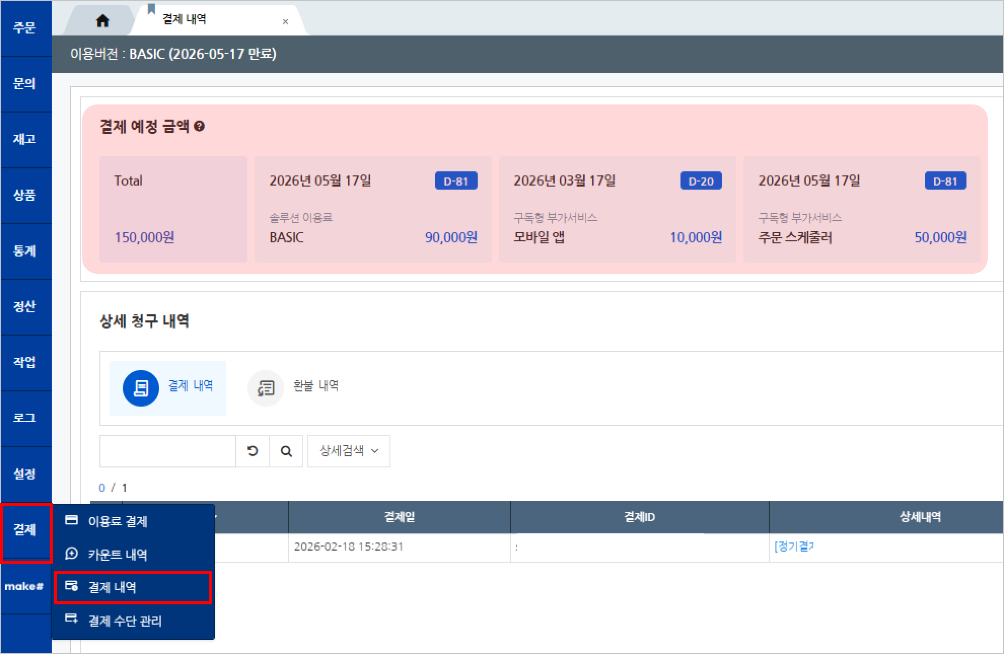 결제> 결제 내역 경로에서 현재 이용중인 솔루션 버전 및 이용료, 구독형 부가서비스 정보를 확인할 수 있습니다.
