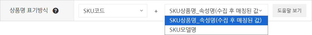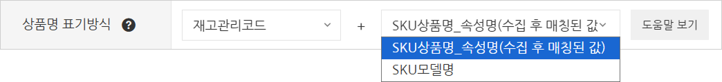 ex. [선택안함 / 판매자관리코드 / SKU코드 / 재고관리코드] + [SKU상품명_속성명 / SKU모델명] : SKU상품 정보가 포함된 조합 대상