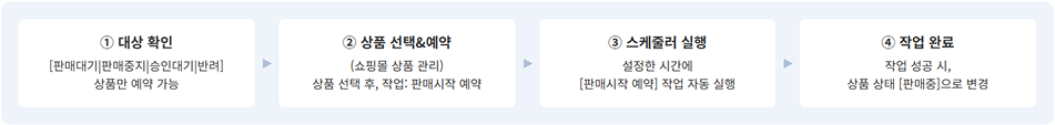 • [판매대기], [판매중지], [승인대기/반려] 상태의 상품을 설정한 시간에 쇼핑몰에서 판매 가능하도록 처리하는 작업입니다.
