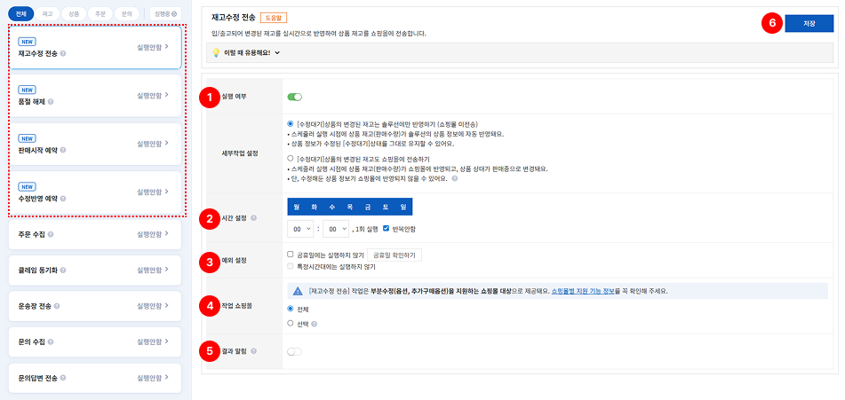 • 솔루션에서 상품 정보를 수정한 [수정대기] 상품이 설정한 시간에 쇼핑몰로 전송되도록 예약하는 작업입니다.