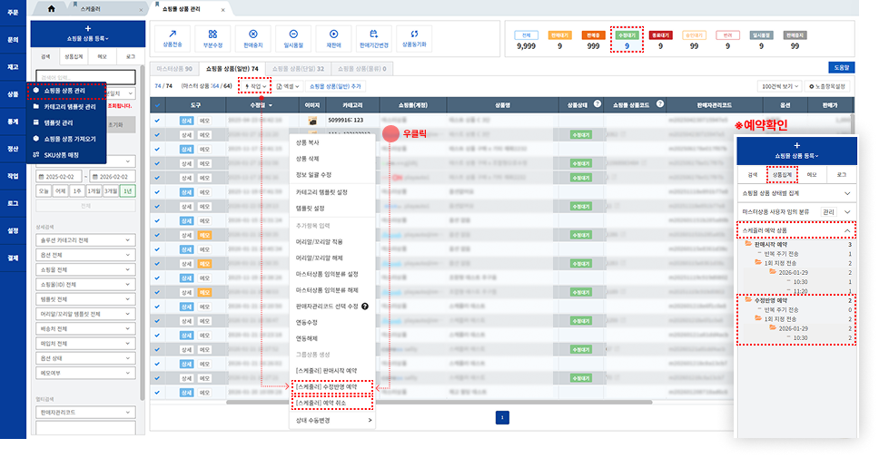 • 쇼핑몰 상품 관리 메뉴에서 상품을 선택한 후, 작업 [수정반영 예약]을 선택해 전송 시간을 설정합니다.