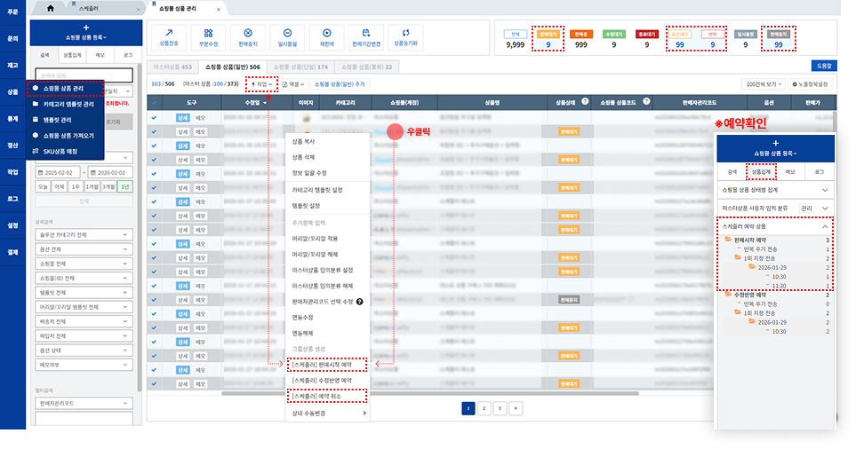 • 쇼핑몰 상품 관리 메뉴에서 상품을 선택한 후, 작업 [판매시작 예약]을 선택해 전송 시간을 설정합니다.