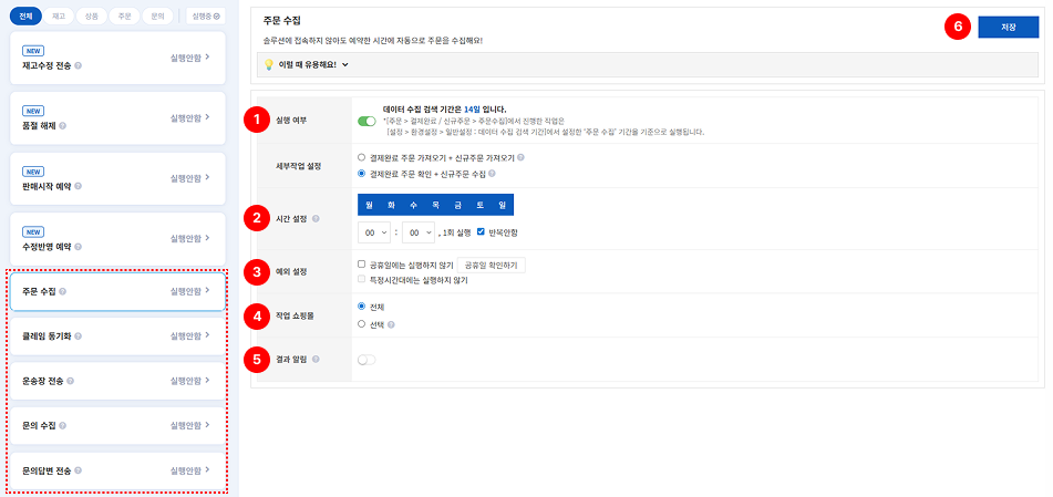 • 설정한 시간에 쇼핑몰의 주문을 자동으로 수집하는 작업입니다.