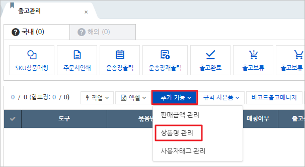 - 주문 > 신규 주문/출고관리 > [추가 기능] > [상품명 관리] 클릭