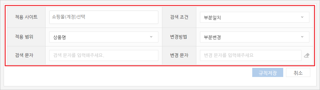 - 적용 범위 : 상품명, 옵션명, 추가구매 옵션명 중 택1