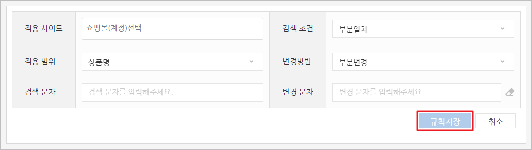 - 적용 사이트 : 전체 쇼핑몰, 직접입력 주문, 쇼핑몰 개별 선택 등 규칙 적용 대상 쇼핑몰 선택