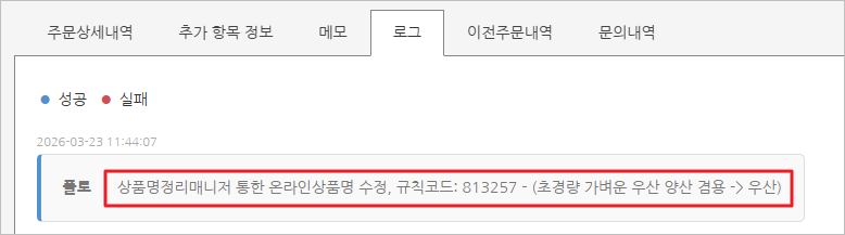 ▼ Tip! 상품명 관리 규칙 적용 이후 각 주문의 [로그]탭에서 수정 내역을 확인할 수 있어요!