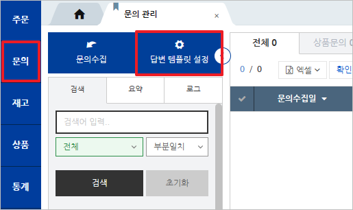 - 경로: 문의 관리> 좌측 상단의 [답변 템플릿 설정] 메뉴 클릭