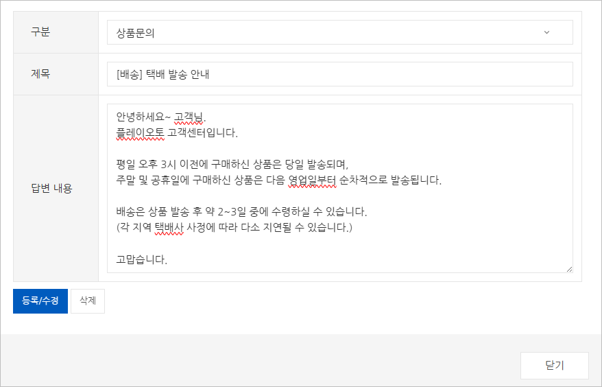 - 구매자들이 자주 묻는 질문에 대한 답변을 템플릿으로 등록 및 관리할 수 있어요.