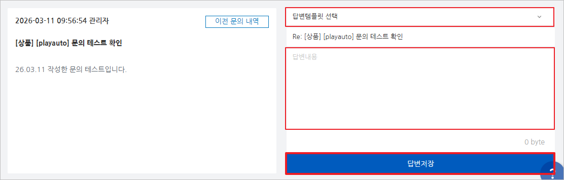 - 문의 내용 상세 화면 우측의 답변 영역에서 [답변템플릿 선택] 또는 [답변 내용] 영역에 직접 입력이 가능해요.