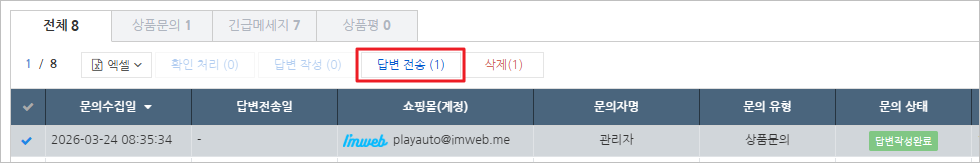 * 이미 쇼핑몰 판매자센터에서 별도로 답변을 완료한 문의라면 솔루션에서 [답변 전송] 작업 시 실패돼요.